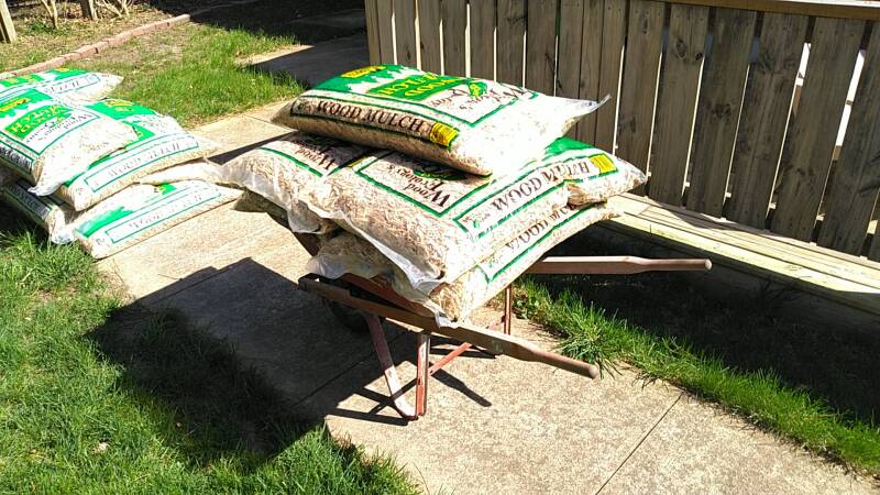 The materials are stored and secured in the back yard inside the fenced in area that has a lockable gate as an entrance. The materials are also stored off of the grass to prevent grass damage and spread out over the concrete patios and sidewalk to prevent the weight of the materials from damaging the concrete--concrete can crack and even sink if too much weight is applied to it. A large pile of these materials can weigh over 1-2 tons easily and the concrete can be damage--be careful when storing heavy piles of materials for such reasons. The mulch is stored on the sidewalk and patios, the River Rock is stored on top of the Horseshoe Pit. (The River Rock is now 64 bags at 50 lbs./bag for 3,200lbs. and will be another 36 bags bringing the total to 100 bags at 5,000 lbs. total.) The Landscape Timbers are stored on the wood deck under the ease.