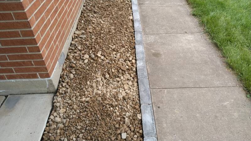 Next, the foundation under the kitchen windows and next to the carport on the south-west corner of the front of the house is prepared for the Rock Border. The ground is raked and shown to be mostly sloped properly already. The Tumbled Belgian Edger Blocks in Quarry Gray color will be used as the edging for this area. They will be placed next to the concrete sidewalk, front door stoop, and driveway next to the carport. The dirt there in those spots is lowered to 1-inch below the top of the concrete where the blocks will sit in the dirt. After this is done, the front yard Rock Border is ready for the plastic sheeting, edging, and rocks.