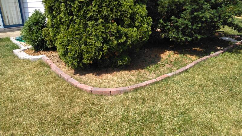 At the start of this project a good assessment was made over the course of a few days. I decided that Landscaping Bricks would be used along the mulch border, and I found some at the supply store at a great bargain and purchased approximately 2/3 of what would be needed for the entire project and began picking them up on Sunday April 9, 2023. The assessment concluded as I walked over the yard both back and front and recorded a video of the property after I started laying out the spots where mulch is to be added. This gave me an idea as to how the landscape will look as it gets worked and what other materials are needed.